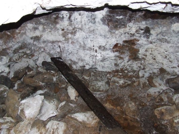 On leaving the tunnel Steve noticed a core hole in the ceiling in what looks like a basalt seam. Apparently there was an old basalt mine nearby in the 1930's. Could this possibly be a test mine to gauge the size of the basalt seam. The main rail tunnel was built in the 1890's. Steve said that both locations were extremely hard to hike to with no nearby road access