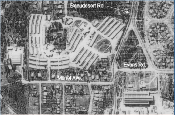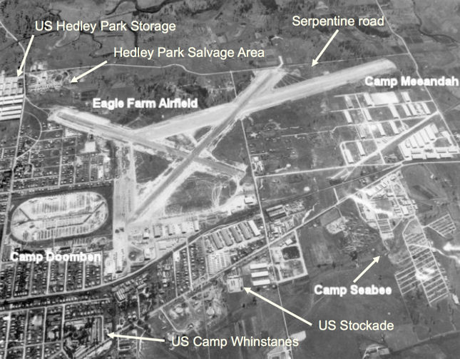 Camp Meeandah is shown at the top right of this 1944 photo of the Eagle Farm area