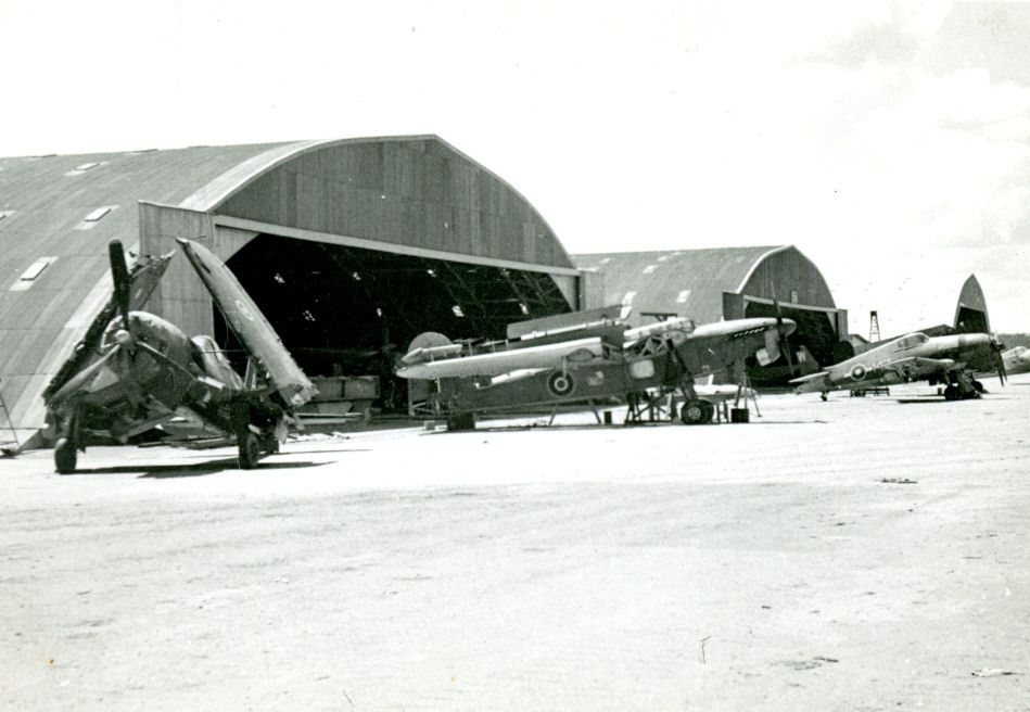 A Corsair, Barracuda, and Hellcat lined up on the tarmac outside the middle two ‘Igloo’ hangers at the Kerry Road site.