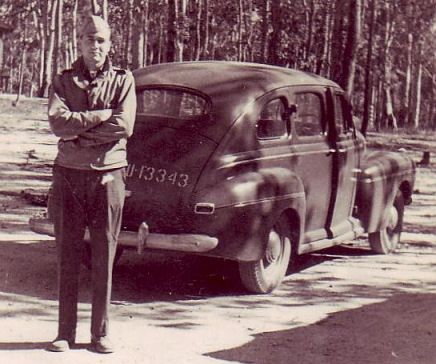 Close-up of 1st Lt. Frederick Boland standing by a vehicle