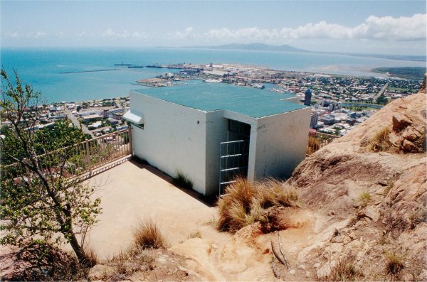 "Fortifications, command post, engine room, and searchlight emplacements were also constructed on Signal Hill. The site selected for the command post was on a pinnacle of rock on the crest of Castle Hill. This necessitated a long and heavy haul of material and men to the parking area at the top of Castle Hill. Thence the material had to be man-handled along a goat track to the site of the job. All concrete had to be mixed by hand and formwork and concrete placed in a very restricted area with a vertical drop on three sides."