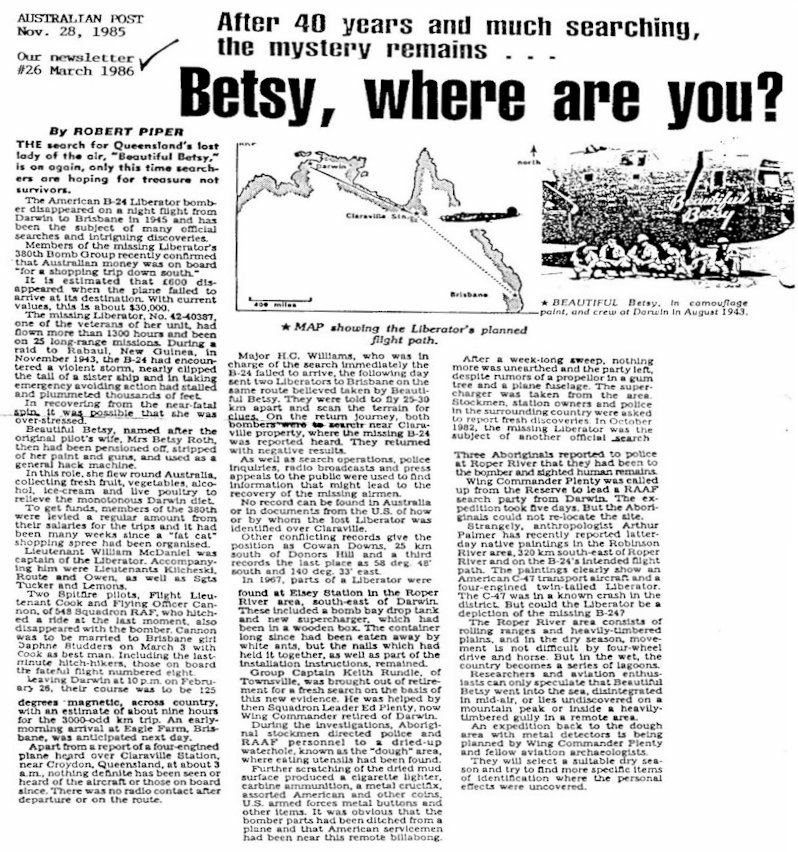 Here is a story about Beautiful Betsy a B-24 lost, You might have seen this, it's from the Australian Post Nov 28. 1985.