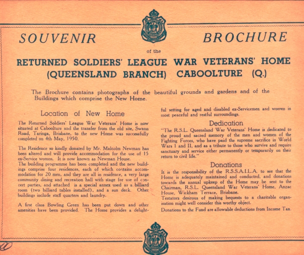 Newman House has now been demolished. All that remains is the water tower. In 1947, the owner, Mr. Malcolm Newman, a World War 1 veteran, donated the house to the Returned Soldiers League War Veterans. Most of the veterans who moved into the complex on 4 May 1950 were from the first War Veterans Home at Swann Road, Taringa in Brisbane.