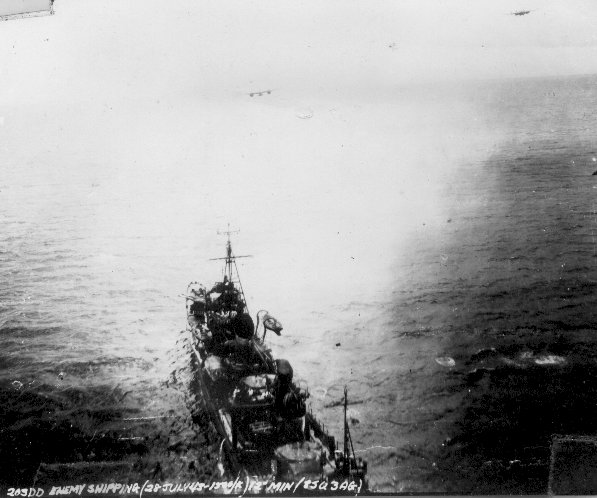 "This is the remains of a Jap Corvette after and during the Third Groups vicious attack on it. Fifteen B-25-C-1's lit into it up near Gloucester Cape one bright sunny afternoon. The attack was led by Col. Hall and Col. "Pappy" Gunn, who got to it just about neck and neck. "Pappy" was flying his well know "Flying Tank" with the French "75" in the nose. The 8th, 13th and 90th participated and got credit for it. They did a thorough job by going back the next day and making sure of the one that was still afloat." |