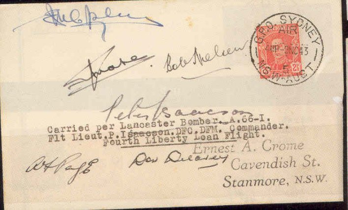 On 5th October 1943, Lancaster, A66-1 (ED 930), "Q" for Queenie VI took off on the 4th Liberty Loan Tour of Tasmania, Victoria and NSW began. Lancaster ED 930 (A66-1) "Q" for Queenie VI, piloted by Flt. Lt. Peter Isaacson, "beat up" the city of Sydney and flew under the Sydney Harbour Bridge on 22 October 1943 to raise funds for the War Loan. The media claimed He did it for the £iberty £oan!
