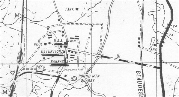 The US Army established a Detention Centre and Rehabilitation Center and Stores Depot at Round Mountain, about 2.5 kms north west of Laravale in Beaudesert Shire in south east Queensland during WWII. Round Mountain was once a quarry which provided ballast for the Brisbane to Kyogle section of the interstate railway line. Round Mountain is now apparently approximately half the size it used to be.