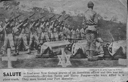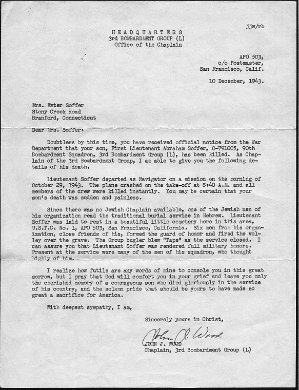 Abraham Soffer, had died in New Guinea on October 29. A letter will follow. Lt. Soffer was born in Waterbury but was a graduate of Branford High School. He had just passed his 25th birthday. He was a former employee of Wm. Van Wilgen and Rockbestos Co. Lt. Soffer, was an honor graduate of the Branford High School with the class of 1938. Enlisting in the U.S. Air Force on December 18, 1941, he advanced rapidly, soon receiving his commission as second, and then as first lieutenant. In February of this year, he telephoned his family from Sacramento, Calif., saying that he had just completed a cross-country flight in a B-25 on which he was a navigator. Shortly after that he was sent overseas and letters arrived from New Guinea, saying that he was well and enjoying his work, and a few weeks ago he wrote of spending a 15-day leave in Australia. Besides his parents, he leaves two brothers, Jacob and Joseph, and two sisters, Jean and Harriet. He was a navigator on a bomber and was awarded the air medal for meritorious action under heavy fire somewhere near the Solomons. He attended a navigator school in Georgia. The medal was awarded for meritorious achievement while participating in an aerial flight over Madang, New Guinea, on May 8, 1943. This aircraft was one of a flight of B-25 bombers engaged on a mission to search for and destroy two enemy vessels in the vicinity of Madang. In the face of intense anti-aircraft fire and opposition from ten enemy fighters, bombs were dropped from low-level on an enemy vessel scoring direct hits and causing it to list badly. The enemy vessel was left in a burning condition and a reconnaissance plane later reported that it was beached, broken up and still smoking and burning. The courage, skill and devotion to duty displayed by these crew members on this occasion are worthy of commendation. |