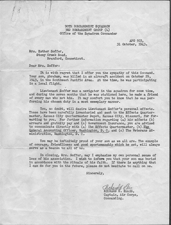 Requesting any & all information you may have on 1st Lieutenant Abraham Soffer 0-791005. Stationed in New Guinea 1943 with the 90th Bombardment Squadron/3rd Bombardment Group APO 503. His plane was the "Notre Dame de Victore" he was chief Navigator on the raid of Rabaul in mid October 1943-please help-sincerely