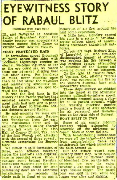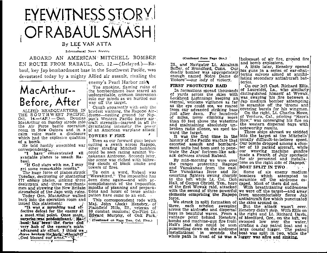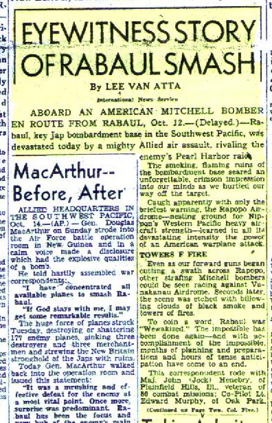 Wrt: Rabaul Raid...My uncle writes on Oct.13,1943..."In the last couple of days we pulled some pretty damn big raids & believe me, did we make the Nips holler ouch!! We caught them with there pants down. I imagine it will get quite a write-up in the papers, & made heard through many radio stations. If you look hard you may find me mentioned in it .The war corespondent rode along with us & wrote the story on our way home. He actually got out his typewriter & ticked away...(I have this copied in the "Pittsburgh Sun Telegraph" paper & the corespondents name was Lee Van Atta story was "Eyewitness Story of Rabaul Smash"-published Oct.14,1943