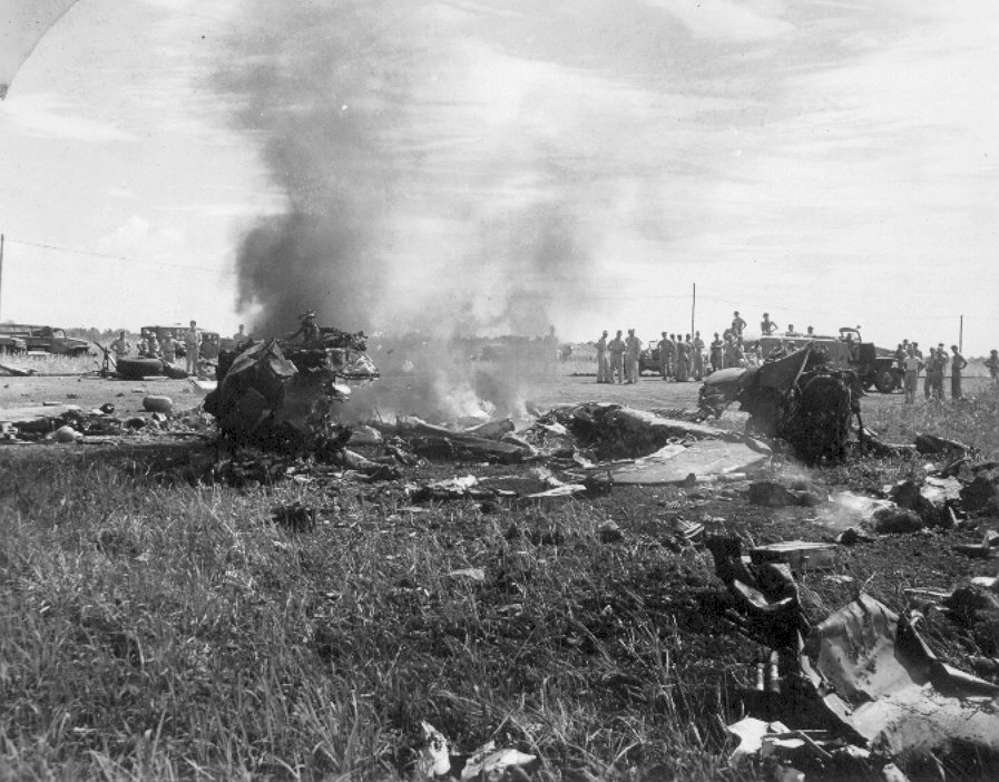 " B-25 #41-30320 crashed on take-off while doing a routine compass check...The exact cause is unknown, but it is believed that an engine cut out....Lt. Lockhart trimmed the a/c up without feathering the bad engine....the bad engine then caught (started) and turned (rolled) the a/c over before Lt. Lockhart could correct......Plane was fully loaded with fuel."