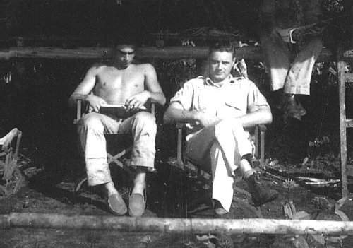 Received the following piccies from my Uncles 2 sisters. One is a shot of my Uncle wearing an Army Helmet, & a handgun. I believe that this is a shot taken in the U.S. probably in training...put it at 1942. There is another shot of him at training in Uniform, I put it at 1942 as well. The last shot I am sending today is a picture of 1st Lieutenant Abraham Soffer 0-791005 in new Guinea, sitting in a hut, along side a friend. No ID on anyone else in the photo, but my Aunt assures me New Guinea 1943.