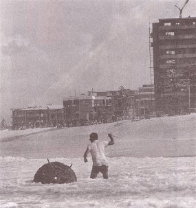 In March 1966, a WW2 German Mine washed up on the beach at Surfers Paradise in south east Queensland. Houses in the Elkhorn Ave and Cavill Avenue areas were evacuated. About 20,000 spectators watched bomb disposal experts hoist the mine up onto a sled. The mine was packed with 340 kgs of explosives. The sled was then towed to the northern end of the Southport Spit where the explosives were removed from the mine and burnt on the spot.