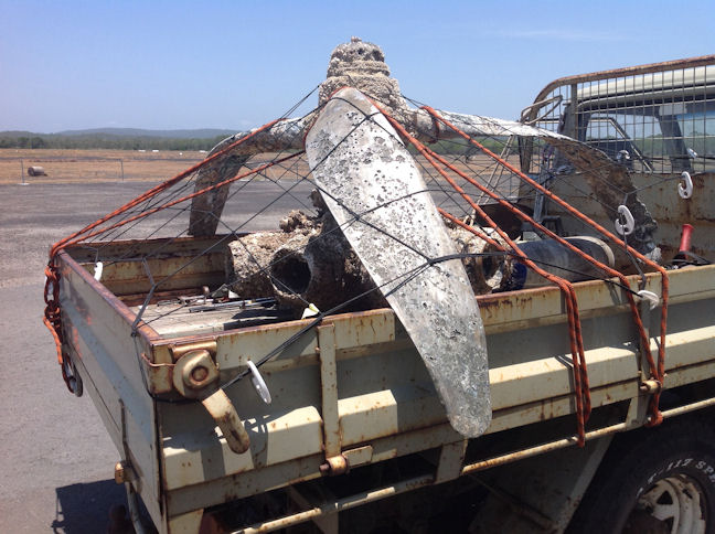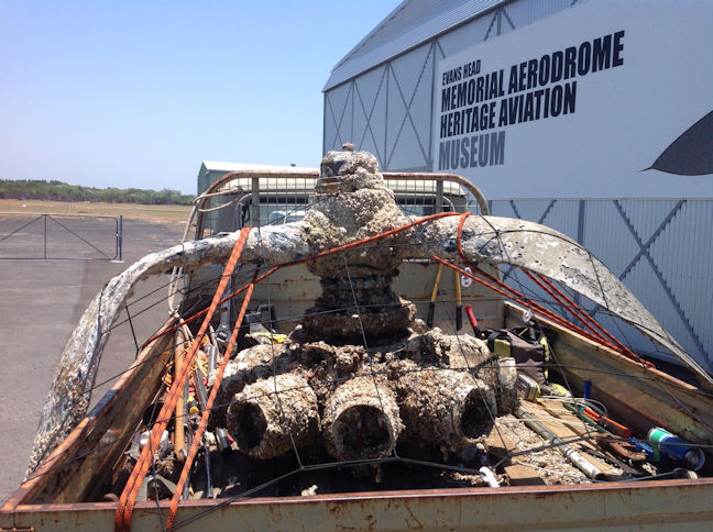 Their $3,500 fishing net was destroyed and they were concerned that the heavily encrusted engine could damage the trawler's hull in the rough seas. One of the propeller blades had snagged on the fishing net's chain. Brendan contacted the Ballina Naval and Maritime Museum who referred them to Richard Gates at the Evans Head Memorial Aerodrome. The radial engine is now in the care of the Evans Head Living Museum.