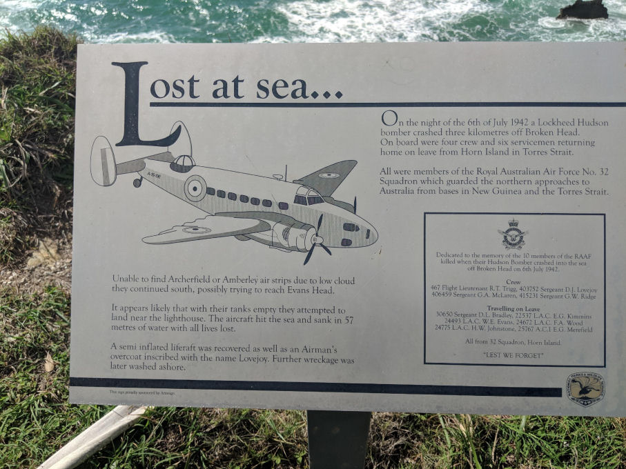 On 6 July 1942, RAAF Lockheed Hudson, A16-198 of 32 Squadron RAAF, crashed into the sea off Tallow Beach, between Broken Head and Byron Bay in northern New South Wales.
