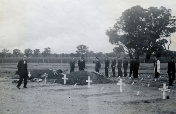 The funeral of McGoldrick & French, Sunday 29 July 1945 at Narromine cemetery.