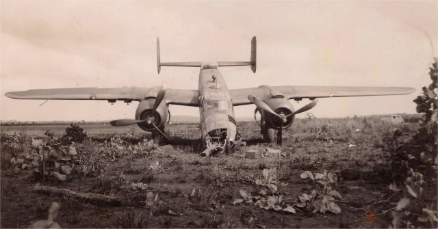 B-25C Mitchell, N5-153, #42-32339, "René", from 18 Squadron of the Netherlands East Indies Air Force (NEI-AF) crashed on landing at Batchelor airfield in the Northern Territory on 9 September 1943 when the nose wheel and flaps refused to work after an evening bombing raid to Laha-Ambon.