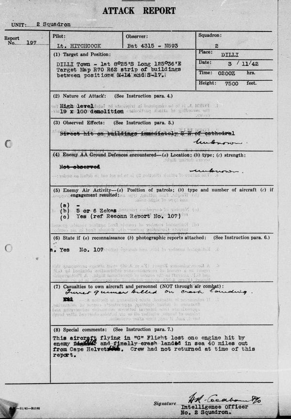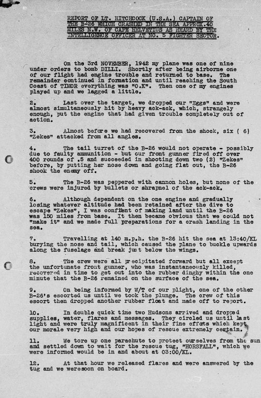 Capt. Hitchcock related: "Our right engine had been put out of action by ack- ack from ground defenses at Dilli, Timor. The left engine was not putting out full power from the time we had taken off from Batchelor Field, Darwin. Both engines were due for a change. We flew along for approximately 2-1/2 hrs. on the left engine, at power settings at what I thought to be about 38 in. of Hq [Hg] and 2400 RPM. But since my instruments were all burned out by the shortage in the electrical system and the blowing up of the pressure tubes in both wings, I had no accurate account of the actual instrument readings.
