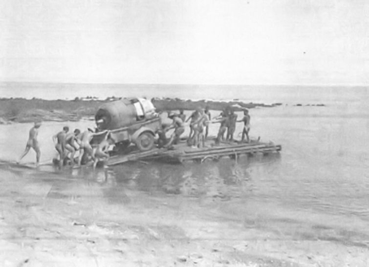 "Croker Island Salvage Expedition" On February 5, B-24 #42-73126 of the 380th Bombardment Group, crash landed on Cape Croker of Croker Island while returning from a bombing mission. On February 7, Lt. Pressfield, T/Sgt. Courtney, and T/Sgt. Davis of the 30th Service Squadron Engineering Section departed from RAAF Field, Darwin, via; aircraft piloted by Squadron Leader Fenton of the RAAF, their mission being to investigate salvage possibilities. They arrived at the scene of the crash in mid afternoon and work was immediately begun in obtaining from the B-24 remains, all serviceable parts not damaged by fire. The advance party was joined by Sgts. Adams & Kolkman, also of the 30th Service Squadron Engineering Section, the following day. They, too, were flown to Croker Island by Squadron Leader Fenton of the RAAF. The Transportation Officer, Lt. Lueck, then engaged in unloading Air Corps Vehicles from the Liberty Ship "Anthony Ravaili" was notified of existing circumstances on Feb. 9 and ordered to make arrangements for removal of aircraft parts from Island and transport to Fenton Field. The Australian Naval Headquarters at Darwin were notified and informed of needs and circumstances involved. As a consequences Lt. Shatwell (R.A.N.) & Lt. Lueck were flown to Croker Island from Bachelor (sic Batchelor) Field by Squadron Leader Fenton, arriving there and making beach landing at approximately 12:00 A.M., Thursday, the 10th. After making arrangements for the pilot to return the following day, the two officers spent the remainder of the day investigating ocean and beach conditions near the wrecked plane. It was ascertained that the ship would be unable to anchor closer than 1 1/2 miles from shore because of treacherous reefs and only at a point approximately one mile Eastward from the plane making the distance all salvaged parts must be transported approximately 2 1/2 miles. All operations, being on the windward side of the island would necessarily be at the mercy of the weather, since numerous reefs around Cape Croker cause large breakers in heavy weather. To further complicate matters, a very sandy area lay between the plane and the proposed raft loading spot as well as a steep bank and a soft sandy beach. It was decided that a Jeep and 1 ton trailer would be the only practical means of negotiating this type of terrain. Lists of necessities were made up and the two officers and T/Sgt. Davis returned to Darwin by aircraft on Feb. 11th. Saturday and Sunday were spent gathering necessary tools and equipment which included Jeep, 1 Ton Trailer, Engine Hoisting Frame, 18 Barrel Raft (capacity 2 ton), 10 sheets Landing Mat, etc. All were stowed on His Majesty's Australian Ship Coolebar (HMAS Coolebar was the tender vessel for the RAN shore establishment in Darwin, HMAS Melville) by 2200, 13th. Four days were taken up by the ships activity and servicing with supplies and replacing personnel at outlying RAAF stations at Cape Don, Goulburn Islands and Croker Island. Cape Croker was reached about mid afternoon on the 17th. Between the Croker Island Mission and Cape Croker (12 miles) the personnel who had been working on the plane and six aborigines were picked up from a native boat. Having completed all possible salvage operations, they were returning to the mission for further orders. It should be stated here that T/Sgt. Courtney, Sgt. Adams, and Sgt. Kolkman did a remarkable job in removing all serviceable and repairable parts from the plane when it is considered that there was but one tool kit and working conditions were hardly tolerable. Upon reaching Cape Croker, the raft was immediately unloaded and the Jeep, wire mat and some equipment loaded on it. An unsuccessful attempt was made to reach shore at 1900 but heavy tides prevented it and the crew and all AAF personnel were forced to anchor just off the reef. After a long wait until 2330 (high tide) another attempt was made and the launch towed the raft on in to a point opposite and 400 yards from the selected landing spot. (Less than one fathom of water covered the reef at high tide. Launch drew 4' 6" and raft drew 14" empty and 24–26" loaded.) By pushing and poling (this method of propelling raft over the 400 yd. tackle lines had been available) the raft was gotten to the beach where planks were laid down and the Jeep unloaded. All personnel including the Aborigines proceeded to the plane and camped there amidst a horde of Mosquitoes and Sand Flies. The following morning, one tire and wheel assembly was loaded on the Jeep, thence to the raft and towed to the ship where it was stowed away in the forward hold. The trailer and remaining tools and equipment were brought ashore on the return trip. Because of heavy tides and launches slow progress therein when towing raft, it was decided to load loose equipment on raft and transfer it to the motor launch at the reef so that better progress could be made while the weather held. The entire day was spent hauling and transferring in this manner and by 1800 only four engines, one rudder, and one elevator remained. At that time the skipper stated that he thought, and it was agreed, that an attempt should be made to get one engine on board that night in spite of the fact that the trailer loading ramp was not yet built on shore. As a consequence, the time was 2100 before the trailer was loaded on the raft and both it and the engine securely lashed down. Excessive time element was mostly due to working in darkness with only two floodlights and the headlights for illumination. The breaking of a plank ramp caused further delay and excitement. Aborigine labour was a big help under the circumstances. The engine was left on the trailer because there was no swinging or mobile crane available to transfer it and because the height gave the motor further protection from splashing salt water. Many times water washed up over the raft when swells became higher than 2 feet. The launch was signalled by lighting fires at cert