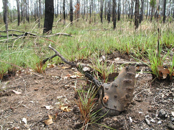 USAAF B-24D Liberator of the 400th Bomber Squadron (Heavy), 90th Bombardment Group, #41-23875, crashed during take-off on a bombing mission from the Iron Range "Gordon" air strip on 26 December 1942 at approximately 10.00pm. Piloted by Lt. Roy Kendrick, the B-24 caught its wing in some trees during the take off. The B-24 hurtled out of control down the runway and crashed "with a sickening roar and blinding flash, followed by a series of huge explosions as the craft's bomb and gasoline load detonated".