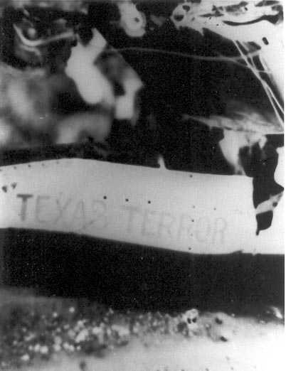 "Texas Terror" was in fact not the nose art name for this B-24 Liberator. It was in fact one of the names painted at one of the station positions on the aircraft. "Texas Terror" was possibly painted at the tail gunner's position. Another station name that was found at the crash site was "Lady Ann". See photos of the two station names below.