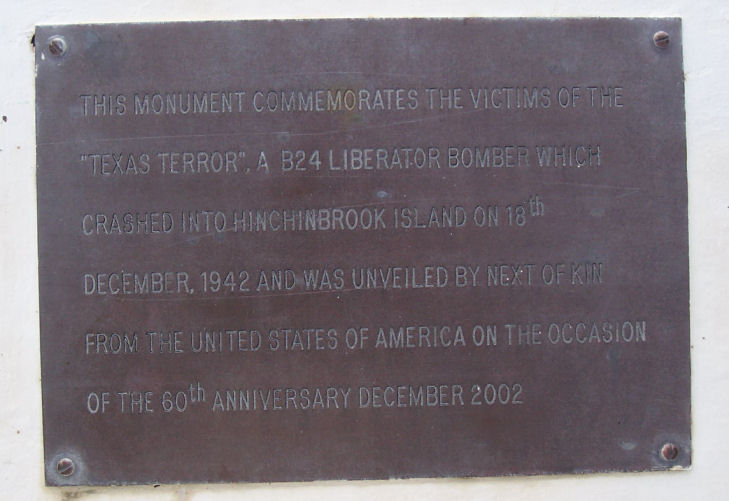 USAAF B-24 Liberator, #41-23825, now commonly known as "Texas Terror", of the 400th Bomb Squadron of the 90th Bomb Group, crashed into the southern side of Mount Straloch on Hinchinbrook Island on 18 December 1942 during a violent storm. It was being flown from Amberley to Iron Range by 1st Lieutenant James Gumaer for delivery to the 90th Bombardment Group. A total of 12 persons were killed in this tragic crash. 1st Lt. Gumaer and his 4 crewmen had picked up at least 7 passengers at Garbutt airfield in Townsville on their way to Iron Range.