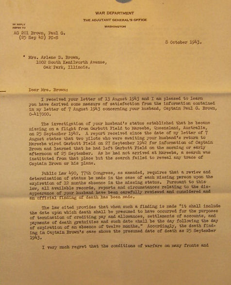 I wanted to pass on this information I was able to obtain. It clarifies mush of the story of Paul Brown's last flight. In August of 2008 Bob Piper gave me a suggestion for a source I had known about through the U.S. Army Total Personnel Command. I made an inquiry and received a package from a Thomas M. Jones, the Chief of the Freedom of Information Office. Included was both a copy of the "Report of Death" investigation, summary of court-martial to the Army Effects Bureau and the Missing Air Crew Report (MACR # 16234.) There were also copies of personnel letters between the War Department and both my mother and Paul Brown's Father that were very interesting.