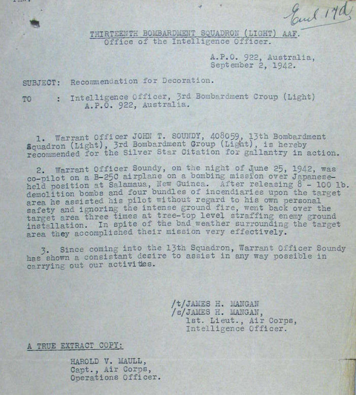 On 2 September 1942, 1st Lieutenant James H. Mangan, Intelligence Officers with the 13th Bombardment Squadron (Light) AAF recommended Warrant Officer John Soundy for the Silver Star Citation for gallantry in action. John Soundy's father, John Soundy (snr), was the Lord Mayor of Hobart at the time that his son went missing.