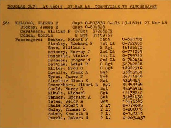 Michael Claringbould's book, "The Forgotten Fifth" mentions that Captain Eldred Kellogg was never seen again after take-off from Cooktown in a C-47 headed for Ward's airfield in Port Moresby on 27 March 1945.