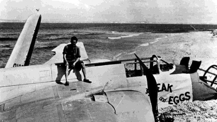 This aircraft, had quite a chequered life. It was actually made by combining two previously wrecked aircraft. Thus the name "The Steak and Eggs" sometimes referred to as "The Steak and Eggs Special". Joe Long and Kip Hawkins were two of the mechanics who constructed "Steak and Eggs" from the wrecks of different aircraft. Chief Mechanic Kip Hawkins was apparently the brains behind producing "Steak and Eggs". (See story below on Joe and Kip.)