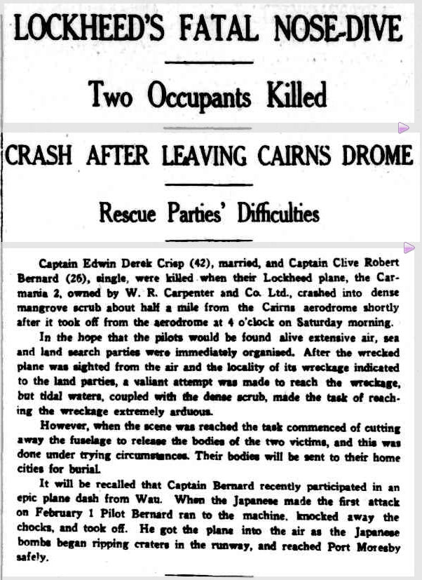 Lockheed L-14-H2 Super Electra aircraft "RMA Carmania", VH-ADS owned by W.R. Carpenter & Co., crashed into dense mangroves about half a mile from Cairns airfield after taking off at 0400 hours. Flight Lieutenant Elwyn Derek Crisp (267519) and Flying Officer Clive Robert Bernard (268072) were both killed. Their bodies were returned to their home cities for burial. F/Lt Crisp had recently participated in a dangerous escape from the Japanese bombing in Wau.