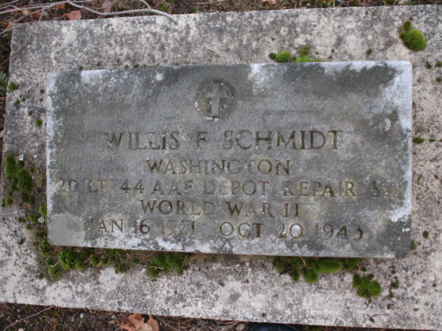 2nd Lt. Willis F. Schmidt (0-798683), a Test Pilot with the 44th Depot Repair Squadron, 81st Air Depot Group, based at Eagle Farm Airfield in Brisbane, Queensland was killed in the crash of an unknown aircraft, on 20 October 1943, possibly in the Brisbane area in south east Queensland.
