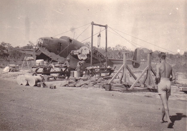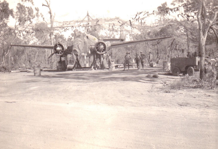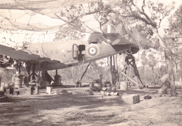 Lockheed Hudson A16-155 being repaired under camouflage netting at Coen
