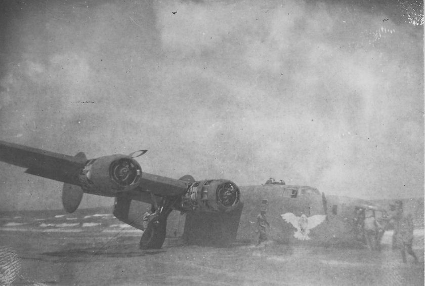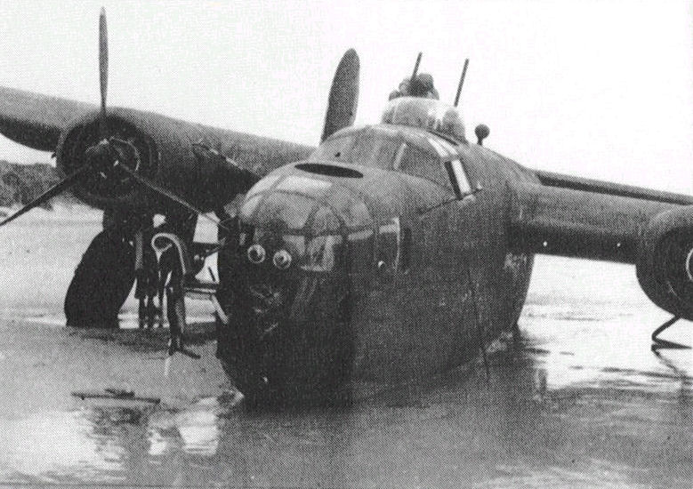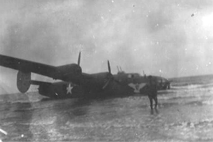 B-24D Liberator #41-23718 "The Condor" of the 400th Bomb Squadron, 90th Bomb Group, experienced fuel transfer issues on its approach to Iron Range Airfield on 15 November 1942. "The Condor" was landed on Quintel Beach by Lieutenant Dale J. Thornhill collapsing one of its main undercarriage.