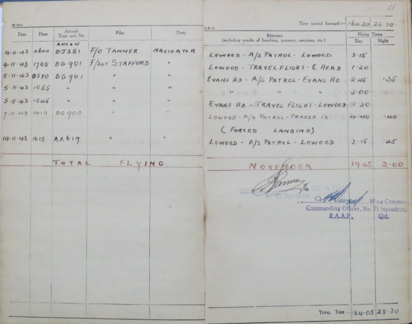 Flying Officer F.W. DENNES, (Engineer Officer) and Flying Officer J.S. GRICE (Radar) departed LOWOOD to inspect crashed aircraft on FRASER ISLAND.12/11/43