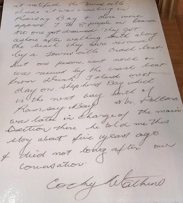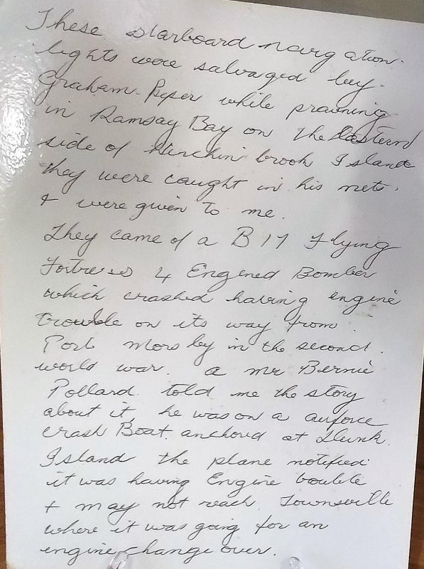 The Cardwell Visitor Centre has a two page note written by a "Cocky" Watkins and a map which are background information for two aircraft Formation Lights which were recovered from an aircraft wreck off Hinchinbrook Island. "Cocky" describes the aircraft as a B-17 Flying Fortress. Both B-24s and B-17s had these types of Formation Lights installed on the end of their wings. The note mentions a Bernie Pollard who was a crew member of an RAAF Marine Crash Boat probably based in Townsville.