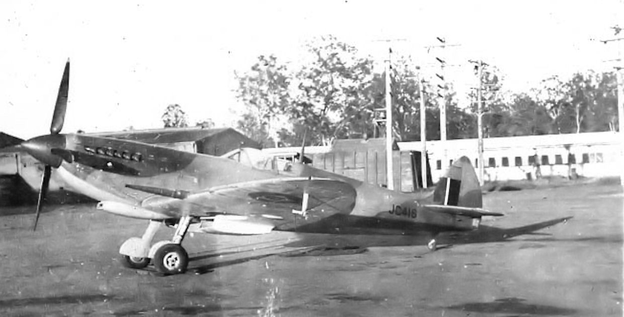 P/O Brown in Spitfire A58-350 JG416 was most unfortunate and crashed after landing which was entirely bad luck not due to his own fault. Someone had left 3 fuel drums in the middle of the runway, and P/O Brown being very tired after the long flight from Amberley, and only too glad to be down after such a harrowing experience, did not see the drums until it was too late and hit a fuel vent with his wing whilst taxying, and ended up on his nose.