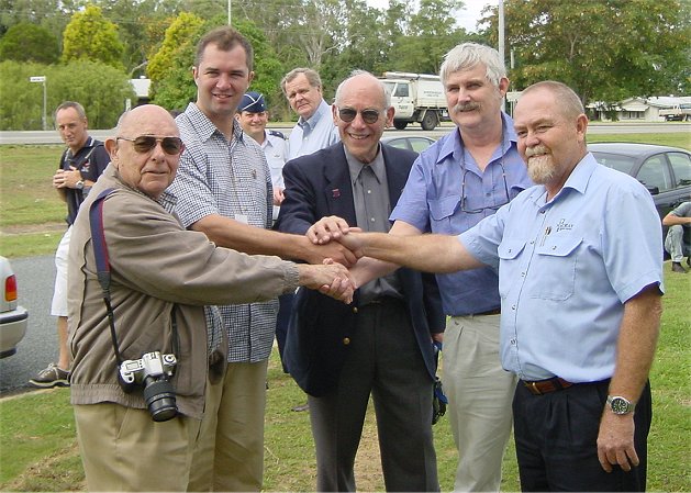 Left to right:- Del Sparrowe (replica concept/creator), Mikey Johnson (sculptor), Professor Robert Cutler (linked to tragedy through late father who closed the door on the aircraft for its doomed flight), Col Benson (Organiser for the 60th Anniversary Commemoration) and Graham Sutton (Mackay City Council). Centre background:- Vice Commander US Fifth Air Force Brigadier General Vern M. "Rusty" Findley USAF and former Commander US Fifth Air Force Lieutenant General John B. "Skip" Hall USAF (Ret.) |