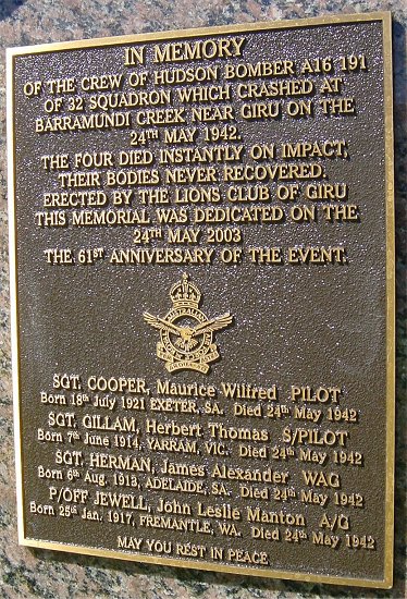 RAAF Lockheed Hudson bomber Mark IIIA, A16-191 BW677 collided with Hudson A16-194 BW680, and crashed into thick mangroves at Barramundi Creek near Giru on 24th May 1942. Both aircraft were from 32 Squadron RAAF. Apparently one of the aircraft had suddenly lost altitude in an air pocket and hit the other aircraft below it. They were apparently both very new aircraft and were on their way from Brisbane to Port Moresby. They were both laden with a full load of bombs at the time of the crash.