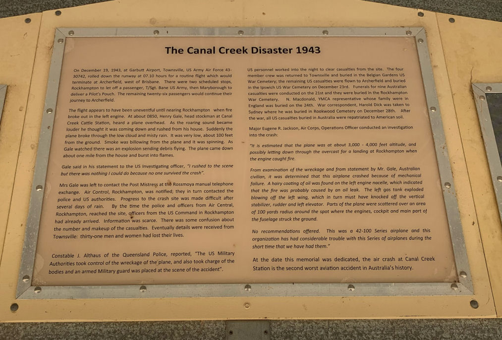 At about 9.20 am on 19 December 1943, a C-47 Dakota, VH-CHR, #43-30742, "Hoosier Traveler" of the 22nd Troop Carrier Squadron of the 374th Troop Carrier Group disintegrated in the air about 30 miles north of Rockhampton near Rossmoya Road at Canal Creek via Yaamba. It had earlier taken off from Garbutt Airfield in Townsville at 7.10K hours enroute to Archerfield airfield in Brisbane via Rockhampton.