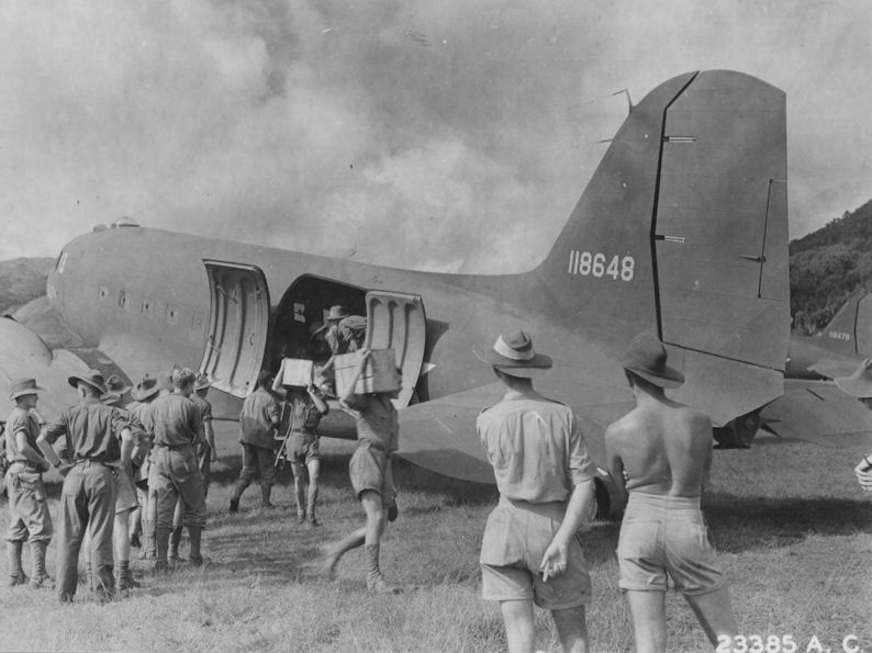 Australian troops unloading C-47-DL, Dakota, #41-18648, call sign