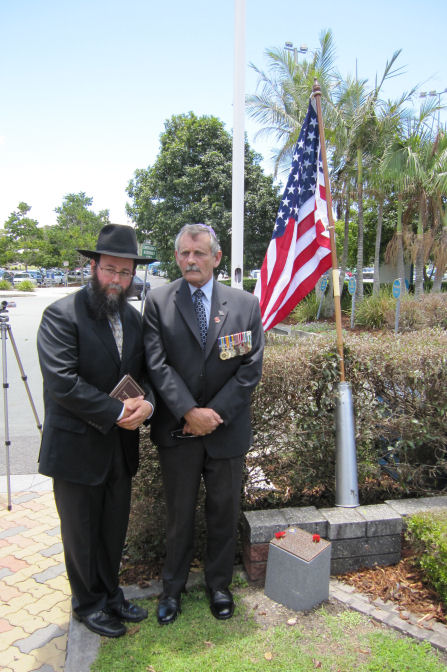 Rabbi Levi Jaffe and David Roubin beside the memorial to 2nd Lt. Sol S. Scherr