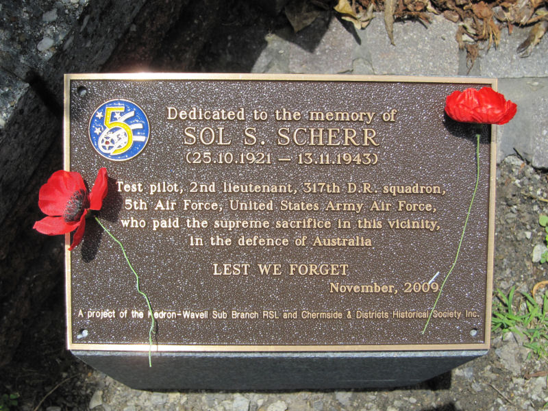 On Remembrance Day, 11 November 2009, a Memorial Plaque was dedicated at the Kedron-Wavell Services Club in memory of 2nd Lt Sol S. Scherr. This was a project of the Kedron-Wavell Sub Branch RSL and the Chermside & Districts Historical Society Inc. A fitting plaque and memorial service to commemorate this American pilot who paid the ultimate sacrifice in his pursuit of defending Australia.