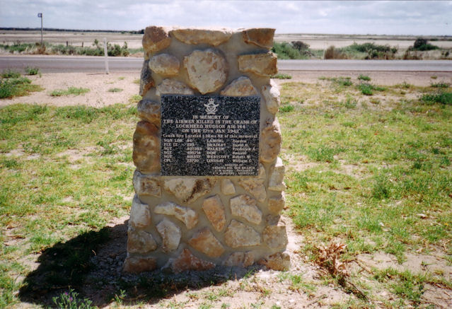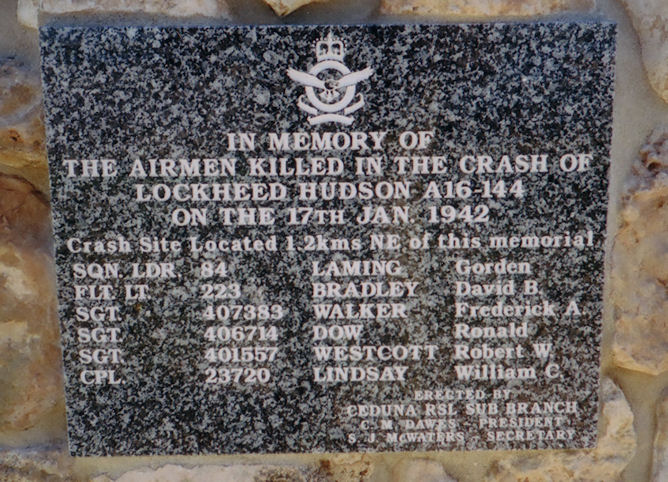 RAAF Lockheed Hudson A16-144 (#41-23214) of 14 Squadron RAAF crashed and caught fire after stalling from about 400 feet after takeoff at Ceduna in South Australia at approximately 1332 Z hours on 17 January 1942, killing the following 6 personnel on board. The aircraft was one of four Lockheed Hudsons on a ferry flight from Laverton to Pearce in Western Australia. It crashed approximately one mile to the north east of Ceduna airfield.