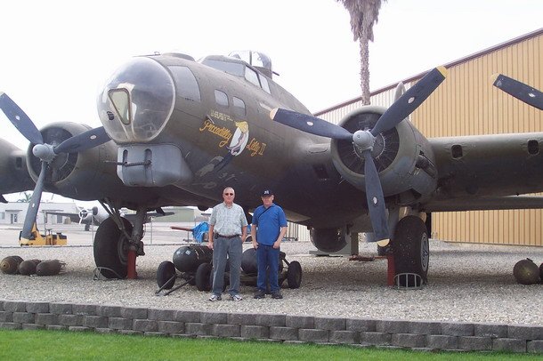 nephew of 2nd Lt Henry O. Null and Rick Hanning standing in front of B-17 Flying