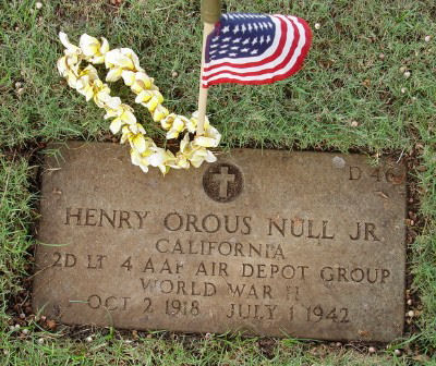 He came from Los Angeles California and was born on October 2nd 1918. His brother 2nd Lt. Robert R. Null (# 0-727650) of the 320th Bomb Squadron, 90th Bomb Group, who was killed in a Liberator crash in New Guinea on 16 April 1943, is buried near Henry, in Grave No 68, Plot D, Row O. Robert R. Null was awarded the Distinguished Flying Cross, Air Medal with Oak Leaf Cluster, and a Purple Heart. Their family was from San Gabriel, California.