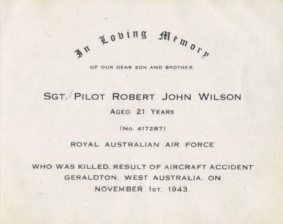 At 11:30 hours A.E.S.T. on 1 November 1943, Avro Anson W2072 of 4 Service Flying Training School 4 SFTS at Geraldton Airfield, crashed 3 miles north of Greenough, in Western Australia.