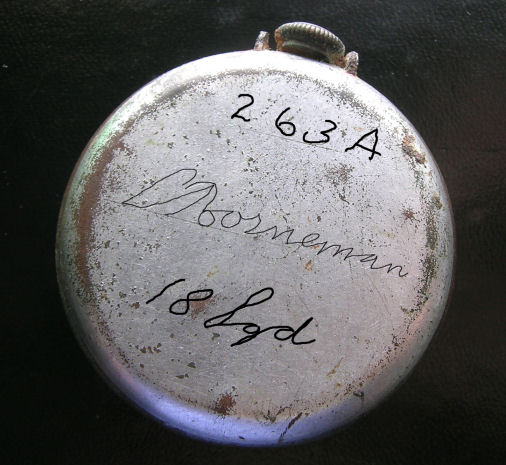 Faintly engraved on the rear plate of the watch was a name and what appeared to be a number. At the time Todd Sinclair was trying to find it's original owner or the family of that person. He wanted to try to reunite the watch with them. Todd told me that the number engraved on the watch was clearly 263A, the name (although fainter) appeared to be L (or C) Borneman.