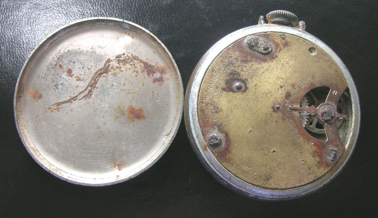 In September 2005, I was contacted by Todd Sinclair from Darwin. During a bushwalk in the Batchelor airfield area some time before September 2005, Todd found a pocket watch made by the E. Ingraham Company of Conneticut, USA simply laying in the dirt in bushland near the WWII Batchelor airfield. Although the watch had sustained some obvious deterioration from around sixty years of exposure to the elements as well as from almost yearly grass fires that burn through that area, it was in relatively decent condition.