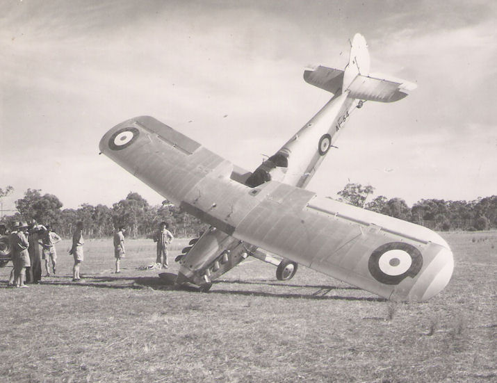 Hawker Demon A1-54 piloted by Bronte Pannell (242) crashed onto its nose at Pearce in Western Australia on 18 March 1939. It would appear that the brakes had been applied too enthusiastically after landing.