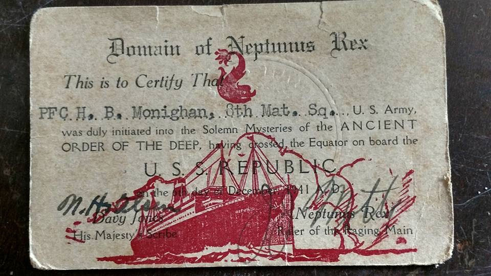Equator Crossing Card belonging to Pfc. Harold B. Monighan of the 8th Materiel Squadron